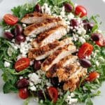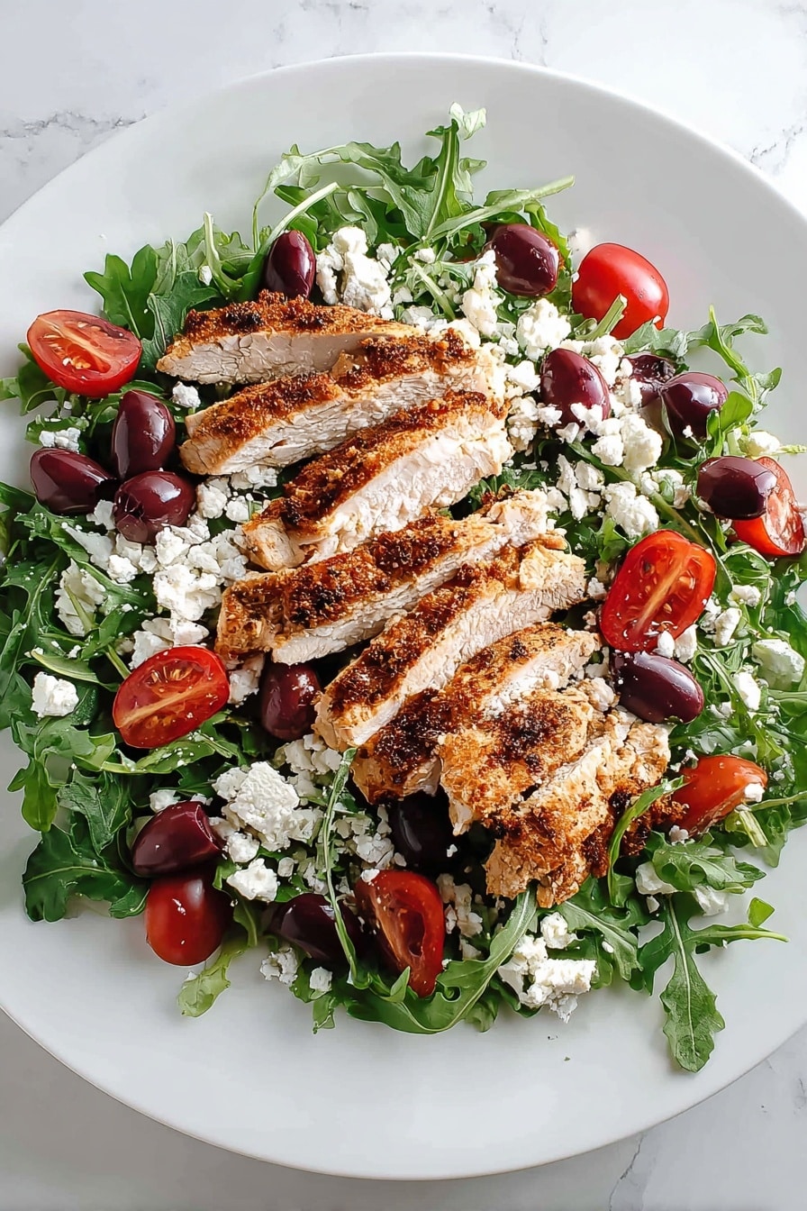 A white plate holds a fresh salad with three clear layers: the bottom layer is bright green arugula leaves spread across the plate, the middle layer has scattered dark purple olives and shiny red grape tomatoes, and the top layer features sliced grilled chicken with a golden-brown crust arranged in the center. Crumbled white cheese is sprinkled lightly over everything, adding a soft texture contrast to the fresh ingredients. The dish is placed on a white marbled surface. Photo taken with an iphone --ar 2:3 --v 7 - Baked Boneless Chicken Thighs, juicy baked chicken thighs, flavorful chicken thigh recipe, easy baked chicken dinner, smoky chicken thigh recipe