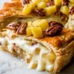 This Baked Brie En Croute recipe features creamy brie cheese layered with sweet, sautéed apples and crunchy pecans, all wrapped in flaky crescent roll dough and baked to golden perfection. Perfect for a crowd-pleasing appetizer, it pairs beautifully with crackers or toasted baguette slices for a delightful balance of flavors and textures.