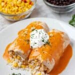 This flavorful Wet Burrito recipe features a large tortilla stuffed with shredded chicken, black beans, corn, and rice, all baked under a rich enchilada sauce and melted cheddar cheese. Topped with a dollop of sour cream, it’s a comforting and satisfying meal perfect for any occasion.