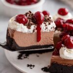 - Add toppings and serve: Before serving, top the cheesecake with homemade cherry pie filling, whipped cream, and chocolate shavings for the classic Black Forest finish.