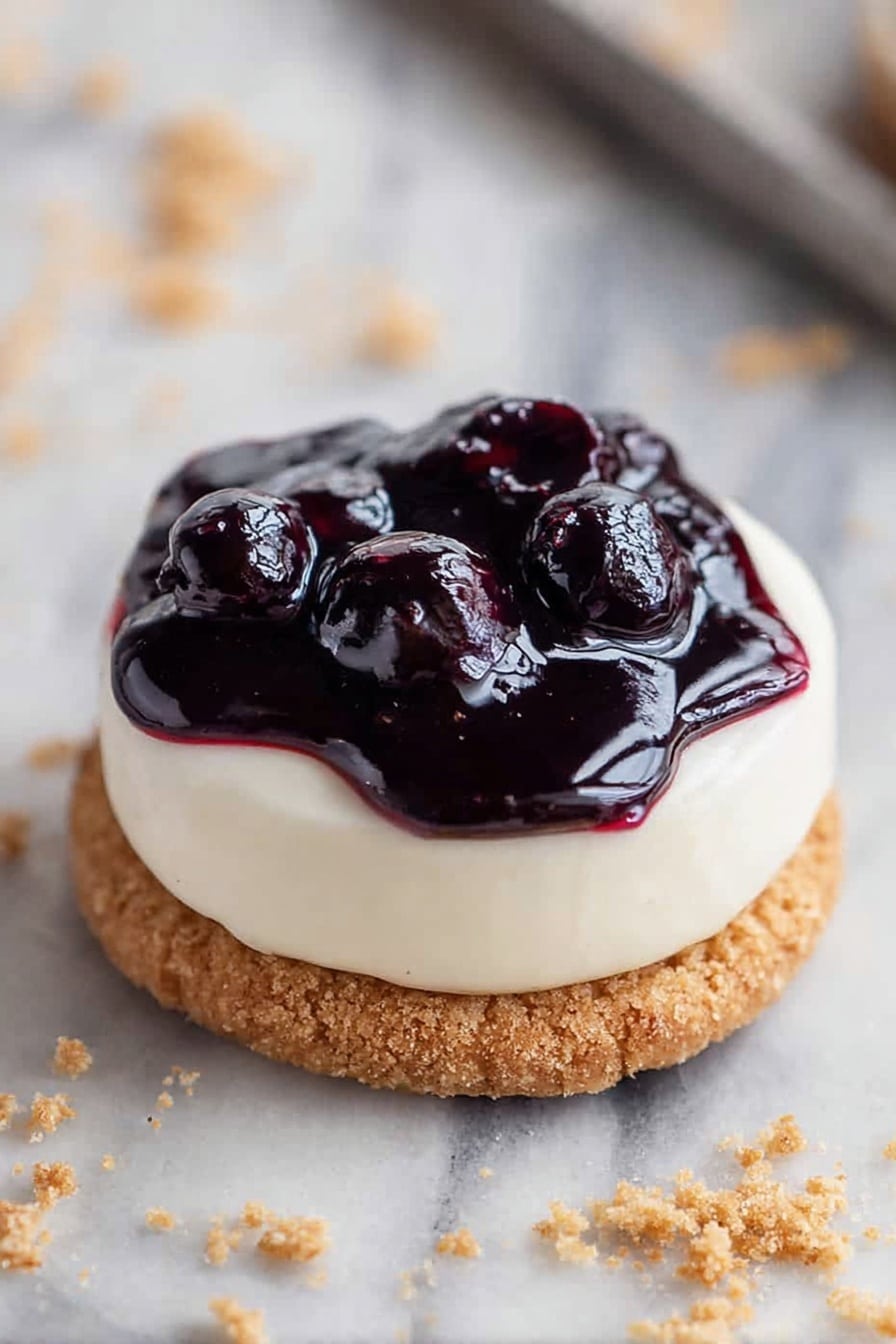 - Top with Blueberry Sauce and Serve: Drizzle the cooled blueberry topping over the cream cheese frosted cookies. Optionally, add a small amount of raspberry jam drizzle for extra flavor. Serve immediately and enjoy these delightful blueberry cheesecake cookies.