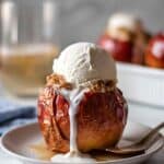 These Bourbon Baked Apples are a cozy, delicious dessert perfect for fall or any time you crave a warm, comforting treat. Large Honeycrisp apples are cored and filled with a spiced oat and brown sugar mixture, complemented by the rich flavors of bourbon and apple cider. Baked until tender and caramelized, these apples are served warm with a scoop of cinnamon, pumpkin, or vanilla ice cream for an indulgent finish.