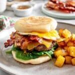 This Breakfast Burger recipe features juicy beef and sausage patties flavored with maple syrup, mustard, and garlic, topped with crispy bacon, melted white cheddar, fresh arugula, and a fried egg. Served on toasted brioche buns with a spicy Sriracha mayo sauce, it’s a hearty and flavorful way to start your day.