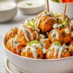 Once the meatballs are out of the oven, toss them gently in ⅓ cup of buffalo sauce so every bite gets that iconic coating of heat. Then, serve immediately topped with diced green onion and cilantro for a fresh pop of color and bite. Don’t forget the bleu cheese yogurt dip on the side — I like to drizzle it or dip the meatballs right in. Adding celery and carrot sticks alongside really rounds out the classic buffalo combo.
