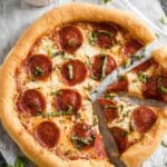 - Rest and serve: Remove the skillet from the oven and allow the pizza to cool for a minute. Use a pancake turner to carefully lift the pizza out onto a cutting board. Garnish with fresh basil, slice, and enjoy!