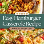 A comforting Hamburger Casserole featuring tender elbow macaroni, savory ground beef, and a flavorful blend of diced tomatoes, mayonnaise, pickles, and spices, topped with melted cheddar cheese and fresh romaine lettuce. This baked dish combines classic cheeseburger flavors into one easy-to-make, crowd-pleasing casserole.