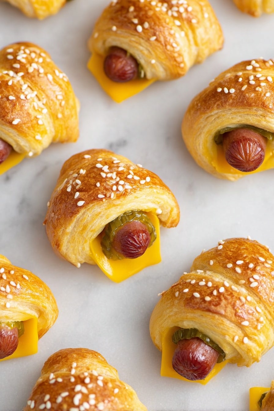 Cheeseburger Pigs in a Blanket are a delicious twist on the classic appetizer, featuring cocktail sausages wrapped in crescent roll dough with American cheese and dill pickle slices, then baked until golden and topped with sesame seeds. Perfect as a snack or party appetizer, these flavorful bites combine the tastes of a cheeseburger into a fun, handheld treat.