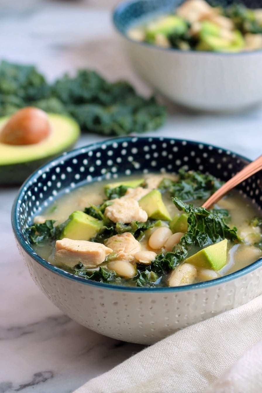 A bowl filled with a light soup containing chunks of pale beige chicken on a rose gold spoon, dark green kale leaves, bright green avocado cubes, and white beans in a light broth; the bowl is white with a blue dotted pattern and a solid blue rim, sitting on a white marbled surface with a cream cloth partially visible at the bottom right; in the blurry background, there is a second bowl with the same soup and a halved avocado and some kale off to the left photo taken with an iphone --ar 2:3 --v 7 - Chicken and Kale White Bean Chili, hearty healthy chili recipe, easy chicken chili, nutritious white bean chili, comforting kale chili