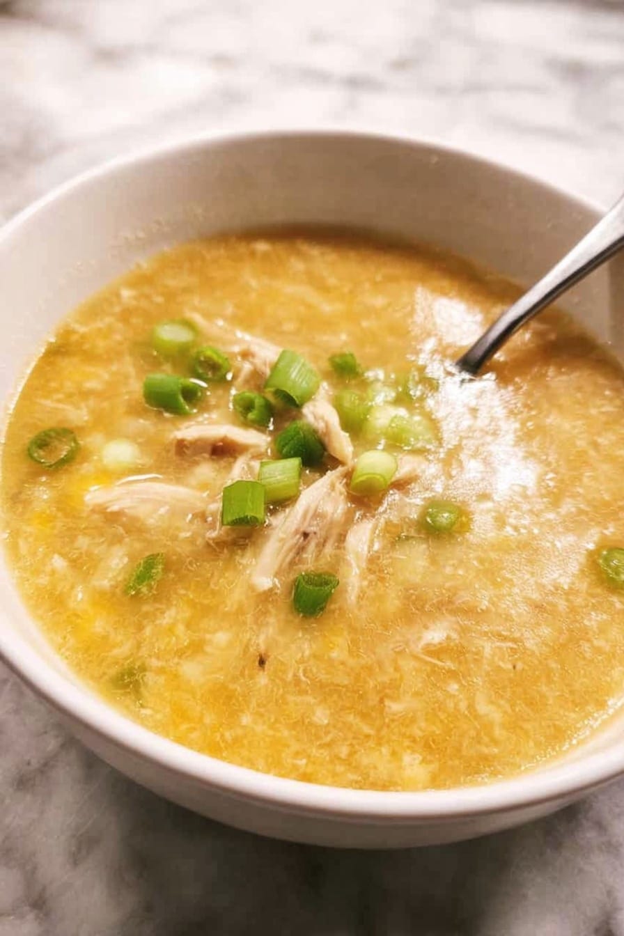 A comforting and flavorful Chinese Chicken and Corn Soup made with tender shredded chicken, sweet creamed corn, and fragrant ginger and garlic, thickened with cornstarch and egg ribbons for a silky texture. Perfect as a quick and warming appetizer or light meal.