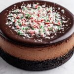 - Finish and serve: Pour the ganache over the chilled cheesecake and sprinkle generously with crushed candy canes. Serve immediately or store in the refrigerator for up to 5 days.