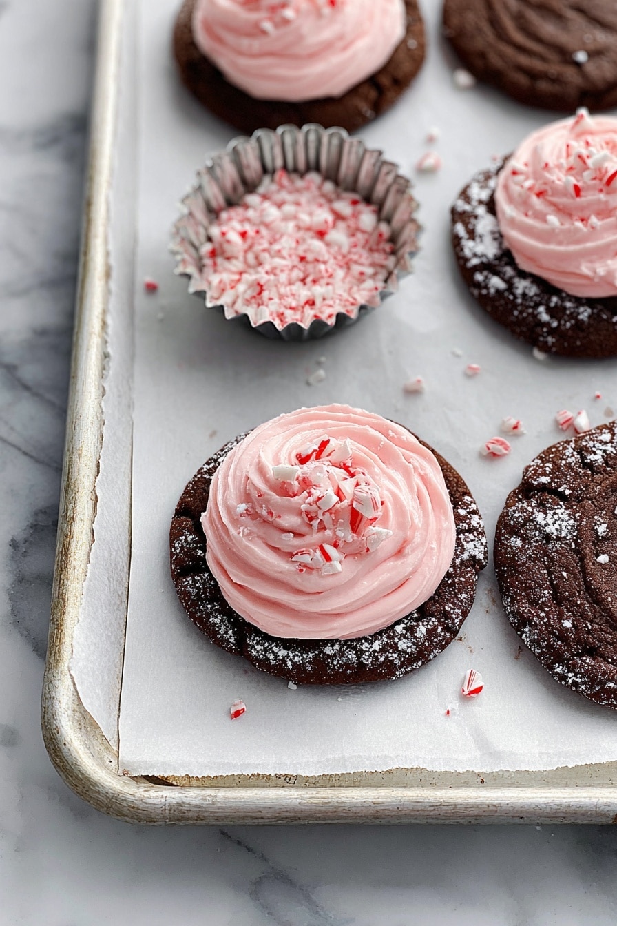 Start by spreading chocolate buttercream on the bottom of each cooled cookie. Then pipe or spread peppermint buttercream on top. Finally, sprinkle crushed peppermint candies over the peppermint frosting—this adds satisfying crunch and a pop of color. It’s the kind of detail that makes these cookies stand apart.