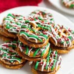These Christmas Caramel Pretzel Bites are a delightful holiday treat combining salty pretzels with soft caramel and festive red, green, and white candy melts. Perfect for parties or gift-giving, they are easy to make and decorated with colorful sprinkles for a cheerful look.