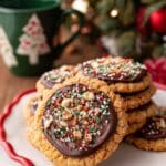Spoon the melted chocolate over each cookie, spreading it to cover the top mostly. Then sprinkle with toasted pecans, extra toffee bits, and those festive holiday sprinkles. Let them set completely—this decoration step adds a pretty and tasty final touch that makes your cookies extra special.