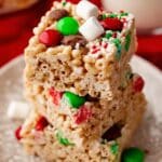Delightfully festive and colorful, these Christmas Krispies Treats combine the classic chewy texture of marshmallow and crispy cereals with a holiday twist. Featuring a mix of rice krispies and rice chex cereals, loaded with Christmas M&Ms and holiday sprinkles, this easy-to-make recipe is perfect for holiday gatherings or as a sweet seasonal snack.
