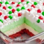 This festive Christmas Lasagna is a no-bake layered dessert featuring a vibrant red vanilla wafer crust, a creamy white cheesecake layer, and a refreshing green peppermint pudding topped with whipped topping, mini marshmallows, and holiday candies. Perfect for holiday gatherings, this visually stunning and delicious treat combines creamy textures and minty flavors for a delightful seasonal dessert experience.