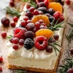 This Easy Christmas Cheesecake Slab is a no-bake delight perfect for festive gatherings. Featuring a buttery Biscoff biscuit crust and a smooth, creamy no-bake cheesecake filling, it’s topped with whipped Chantilly cream and decorated with fresh berries, cherries, orange slices, and rosemary sprigs for a festive finish. The recipe is straightforward, requiring no oven and just refrigeration to set, making it ideal for stress-free holiday celebrations.