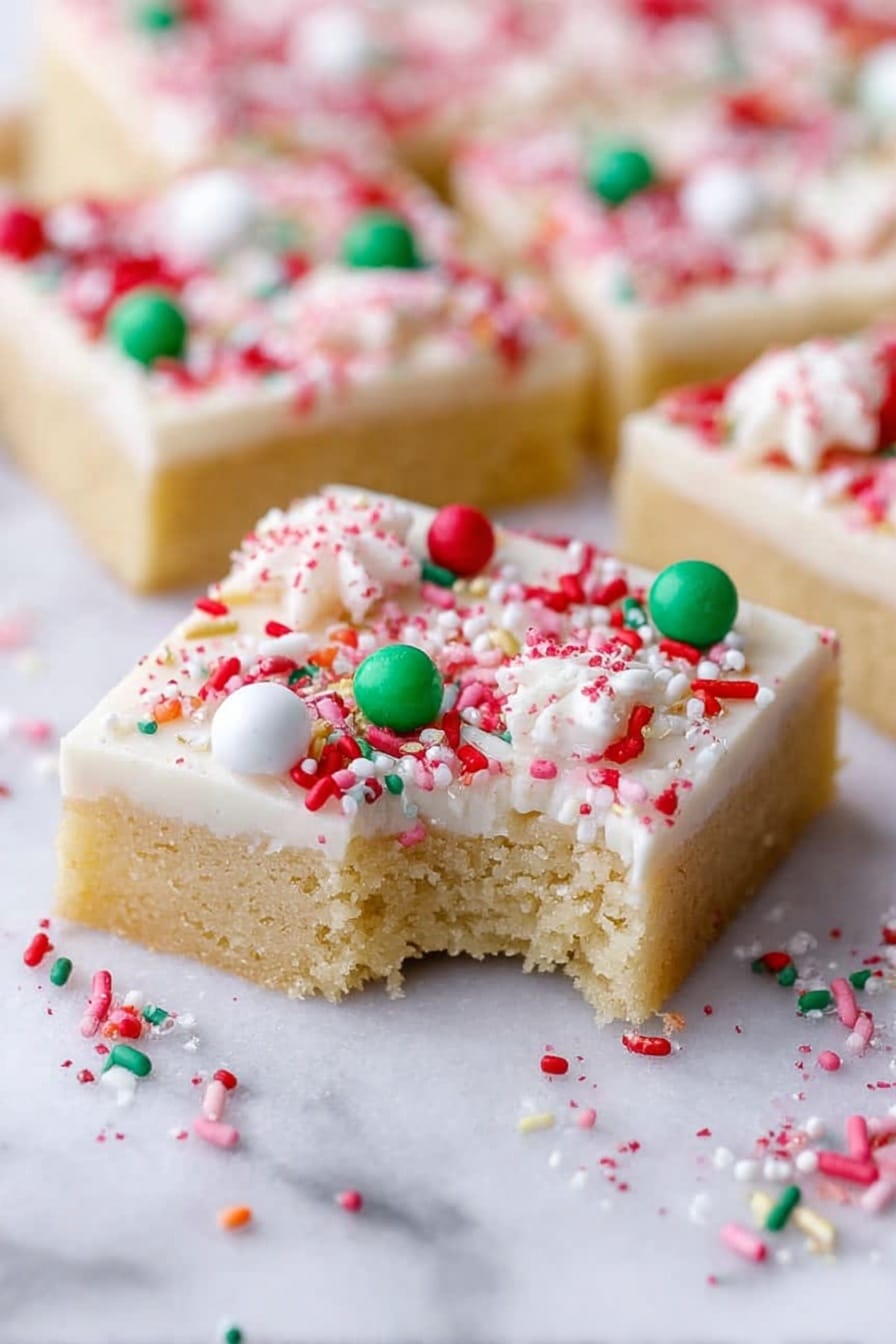 Delight in these festive Christmas sugar cookie bars featuring a buttery, tender cookie base topped with a creamy vanilla frosting and colorful holiday sprinkles. Perfect for holiday gatherings, they combine comforting classic sugar cookie flavors with an easy-to-slice bar format.