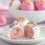 Grab a chilled cookie ball with a fork and dip half of them into the hot pink candy melts. Tap off any excess coating by gently hitting the fork’s edge against the bowl. Place them back onto the parchment paper, then sprinkle with your rainbow nonpareils right away while the coating is still wet. Repeat the dipping and decorating for the rest using the white almond bark, and watch those little dots sparkle with happiness.