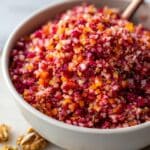 This Cranberry Orange Relish is a fresh, tangy, and slightly sweet condiment perfect for holiday meals or any occasion that calls for a burst of vibrant flavor. Made with toasted walnuts, tart cranberries, a juicy navel orange with peel, sweet crisp apple, honey, and a splash of orange liqueur, this relish offers a unique blend of crunchy texture and fruity zest. It requires no cooking beyond toasting the nuts and comes together quickly in a food processor, making it an easy, make-ahead side dish or topping.