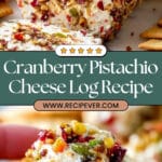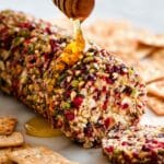 This easy and elegant Cranberry Pistachio Cheese Log is a perfect appetizer for holiday gatherings or any special occasion. A creamy blend of goat cheese and cream cheese flavored with warm spices, honey, and herbs is rolled in a vibrant coating of chopped fresh cranberries and roasted salted pistachios. Served with a drizzle of honey and your favorite crackers, this cheese log offers a delightful combination of tart, sweet, and savory flavors with a wonderful contrast of creamy and crunchy textures.