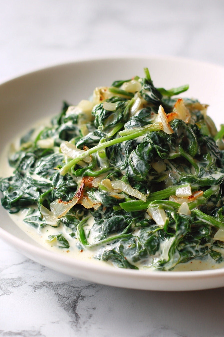 Creamed Spinach is a classic, creamy side dish featuring fresh spinach steamed to perfection and combined with a rich, cheesy sauce made from butter, onions, cream, and Parmesan cheese. This recipe delivers a flavorful, comforting vegetable accompaniment that’s perfect for any meal.