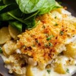 A deliciously creamy fish on potato gratin featuring tender white fish fillets baked over a flavorful leek, garlic, and potato base with a crispy parmesan panko topping. This comforting meal combines the rich textures of creamy gratin and succulent fish, enhanced by white wine and vegetable stock, perfect for an elegant yet simple dinner.