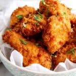 - Fry the Chicken: Carefully place a few chicken pieces into the hot oil, leaving about 1 inch space between them to prevent sticking. Fry for about 7 minutes on the first side until golden brown, then flip and fry another 3 to 5 minutes. The chicken is done when it reaches an internal temperature of 165°F or a total frying time of 12 to 15 minutes.