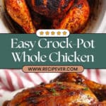 My favorite sides to pair with this Crock-Pot whole chicken are creamy mashed potatoes or a simple garlic roasted vegetable medley. The rich, tender chicken pairs perfectly with those carbs and the vibrant veggies bring balance to the plate. I’ve also done it with fluffy rice and a crisp green salad for a lighter meal.