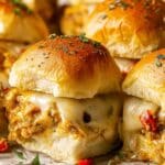 - Assemble the Sliders: Slice the slider buns in half horizontally. Place the bottom halves evenly in the prepared baking dish. Spread the sauce evenly on the insides of both the bottom and top buns. Spoon the cooked chicken mixture over the bottom buns and sprinkle generously with shredded mozzarella cheese. Place the top buns on each slider and press down gently. Brush the tops with the garlicky herb butter mixture.