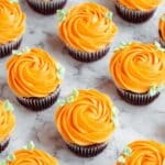 - Pipe Pumpkin Swirl: Fit a pastry bag with a 1M open star decorating tip and fill it with the orange-colored buttercream. Pipe an orange rose swirl onto each cooled cupcake to form the pumpkin design. For guidance, watch tutorials on how to frost a rose cupcake. Continue this process until all cupcakes are topped with the pumpkin swirl.
