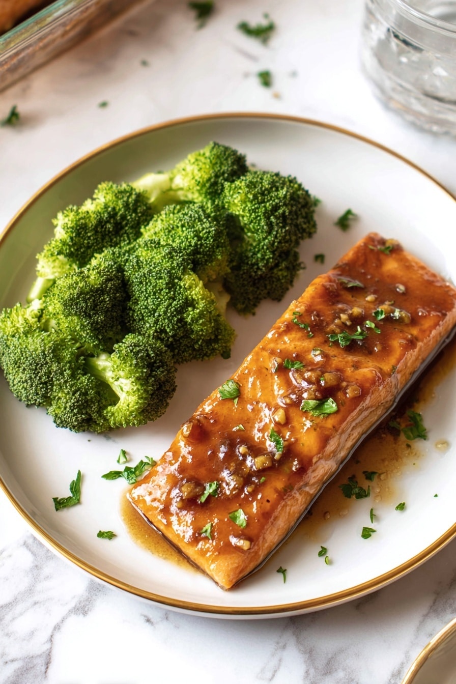 A white plate with a golden rim holds two main parts: on the left, bright green broccoli florets with a rough texture stacked close together; on the right, a single rectangular piece of cooked salmon covered in a shiny brown glaze with small bits of herbs and garlic visible on top, sprinkled with small green parsley leaves, some glaze and parsley leaves also around the salmon on the plate; the background is a white marbled surface with part of another similar plate and a clear glass dish blurred in the back. Photo taken with an iphone --ar 2:3 --v 7 - Easy Baked Salmon with Honey Soy Glaze, honey soy glazed salmon, baked salmon recipes, simple healthy salmon dinner, flavorful salmon glaze