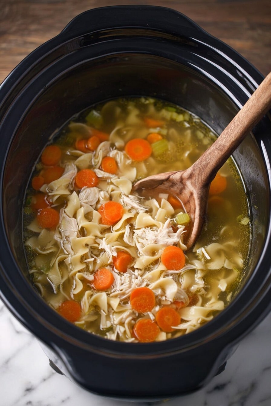 3. Add Noodles: After 2 ½ hours of cooking, carefully remove the lid and stir in the egg noodles. Replace the lid and continue cooking on HIGH for an additional 30 minutes until the noodles are tender.