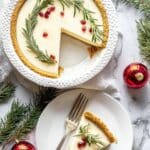 - Serve and Decorate: Remove the springform pan collar, slice, and serve. Optionally, decorate with pomegranate seeds and fresh rosemary for a festive touch.