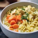 This Ginger Turmeric Chicken Soup is a fragrant and comforting bowl of wellness, featuring tender chicken, nourishing vegetables, and the anti-inflammatory benefits of turmeric and ginger. Enriched with creamy coconut milk and hearty egg noodles, this soup is a perfect balance of savory flavors and soothing warmth, ideal for any day you need a satisfying, healthy meal.