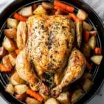 Toss your potatoes and carrots in the remaining half of the lemon-garlic mixture and spread them evenly in the bottom of your roasting pan. If you have a roasting rack, set it over the veggies and place your chicken breast-side up on the rack. This setup ensures even heat circulation and lets the chicken juices drip onto the veggies for amazing flavor. If you don’t have a rack, placing the chicken directly on top of the veggies works just fine, too.