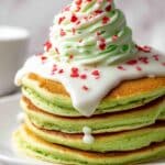 Celebrate the holidays with festive Grinch Pancakes, vibrant green pancakes topped with creamy cheesecake icing, fluffy green whipped cream, and cheerful red heart sprinkles. This fun, colorful breakfast recipe combines tender, fluffy pancakes with rich and light frosting for a delightful Christmas treat the whole family will love.