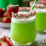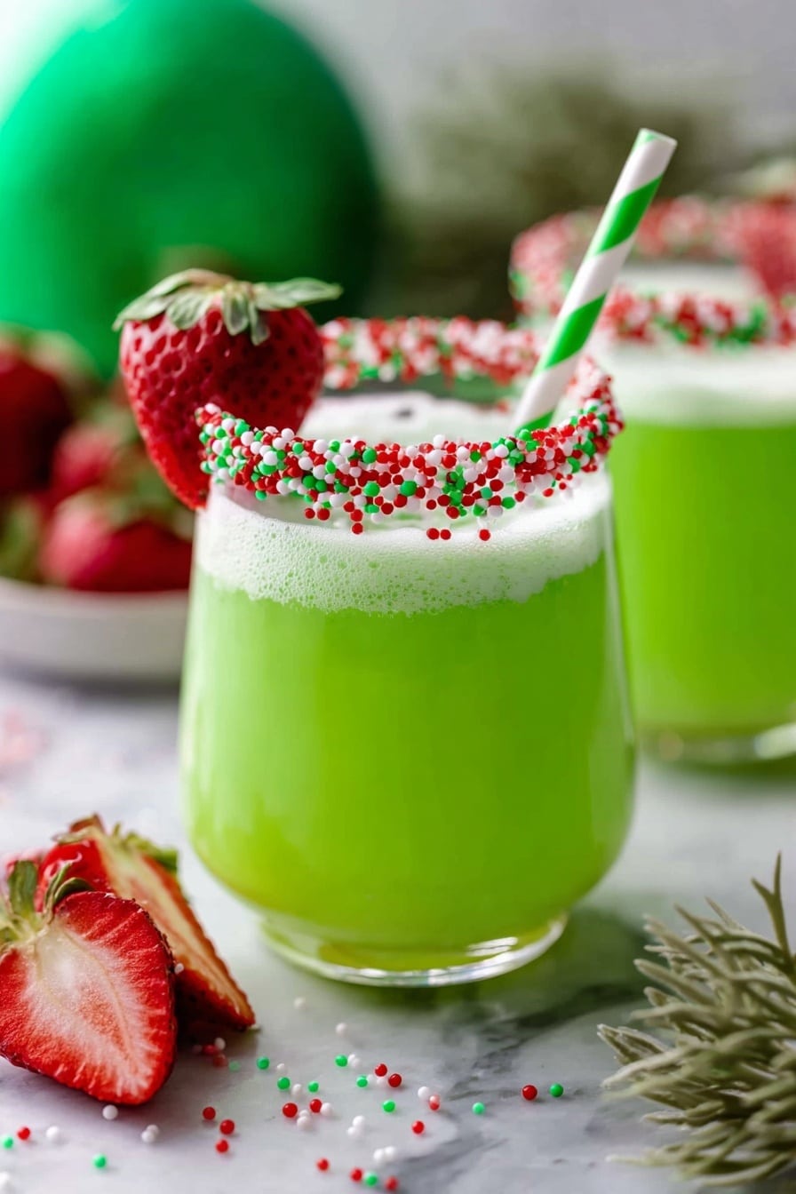 I usually keep it classic with those festive strawberry hearts and sometimes add a sprig of fresh mint for a pop of green, which matches the Grinch theme perfectly. If you want a fun twist, try sprinkling some red and green holiday sprinkles around the rim—it adds a little holiday sparkle that guests love.