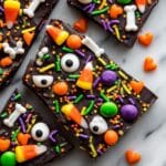 4. Add toppings: While the chocolate is still warm and soft, evenly sprinkle candy corn, Halloween sprinkles, candy eyeballs, and any other chosen toppings over the surface.