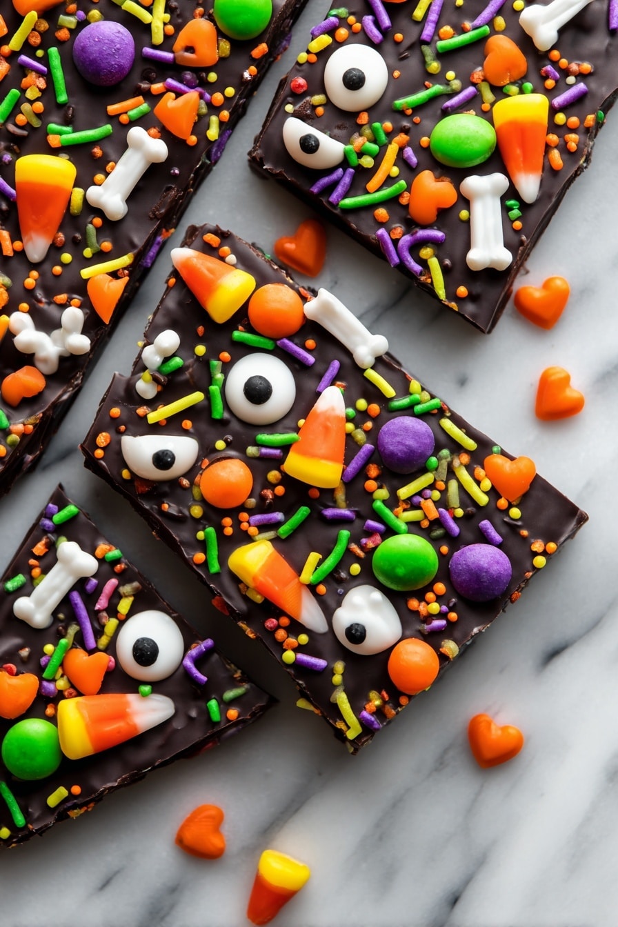 The image shows several pieces of chocolate bark broken into irregular shapes and spread out on a white marbled surface. Each piece has a deep dark brown chocolate base with various colorful toppings scattered evenly on top. The toppings include yellow, orange, and white candy corn, large white candy eyes with black pupils, small orange and green round candies, and multicolored sprinkles in purple, green, orange, and white shaped like tiny bones and confetti. The texture of the chocolate is smooth but slightly wavy, and the candy decorations add a fun and playful look to the bark. Photo taken with an iphone --ar 2:3 --v 7 - Halloween Chocolate Bark, Halloween Chocolate Bark Recipe, Festive Halloween Candy, Easy Halloween Treats, Spooky Chocolate Dessert