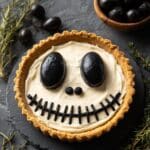These Halloween Jack Skellington Ricotta Olive Tarts are a spooky and savory treat that combines a gluten-free, crisp tart crust with a creamy ricotta and Greek yogurt filling, flavored with garlic, thyme, and parmesan. Decorated with black olives and sun-dried tomatoes to create Jack Skellington’s signature face, these tarts are perfect for festive Halloween gatherings and are baked until the filling is perfectly set.
