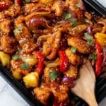 - Add Sauce and Toss: Remove the pan from the oven and drizzle the prepared Hawaiian sauce over the chicken and vegetables. Toss everything thoroughly to coat well, then spread the mixture back into an even layer on the pan.