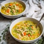 This comforting and flavorful chicken soup combines aromatic garlic, fresh herbs, and a touch of ginger and turmeric for a warm, nourishing meal. With tender chicken, pearl couscous, and optional peas, it’s a hearty soup perfect for any season.