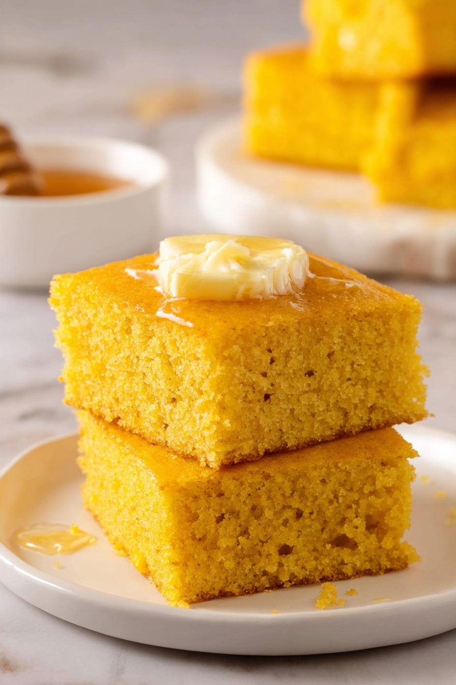 Two squares of yellow cornbread with a crumbly texture lie stacked slightly on a round white plate, with some crumbs scattered around. Another white plate with more squares of cornbread partially appears on the top left. Near the plates, there are two gold forks placed side by side on a white marbled surface. A fluted white dish holding a square of pale butter is in the top right, and a small white bowl with honey and a wooden honey dipper is at the bottom right. A light beige cloth is partly visible at the bottom left. Photo taken with an iphone --ar 2:3 --v 7 - Healthy Cornbread, healthy cornbread recipe, wholesome cornbread, oat flour cornbread, nutritious cornbread
