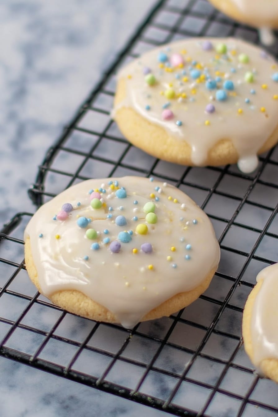 Three round cookies rest on a black cooling rack. Each cookie is covered in a smooth, shiny white icing that drips slightly over the edges. The icing is decorated with small round sprinkles in pastel colors like yellow, blue, green, and pink, scattered unevenly on top. The cookies have a soft, light beige color beneath the icing. The cooling rack is placed on a white marbled surface. Photo taken with an iphone --ar 2:3 --v 7 - Healthy Gluten-Free Anginetti Cookies, gluten-free cookies recipe, healthy cookie recipes, sugar-free cookie ideas, easy gluten-free baking