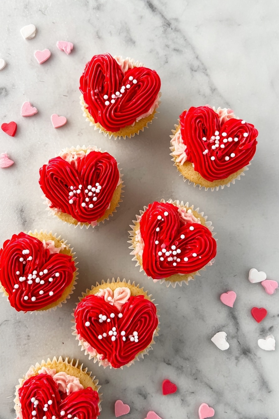 Now, the best part—decorating! You can pipe mini rosettes by holding your piping bag vertical and swirling small circles with a star tip. Or, try a criss-cross design by angling your piping bag and crossing lines over the cupcake. I also love outlining the heart edges with tiny dots of frosting and filling the center with more dots for a pretty look. Don’t forget a sprinkle or two on top for extra fun. You really can’t go wrong here!