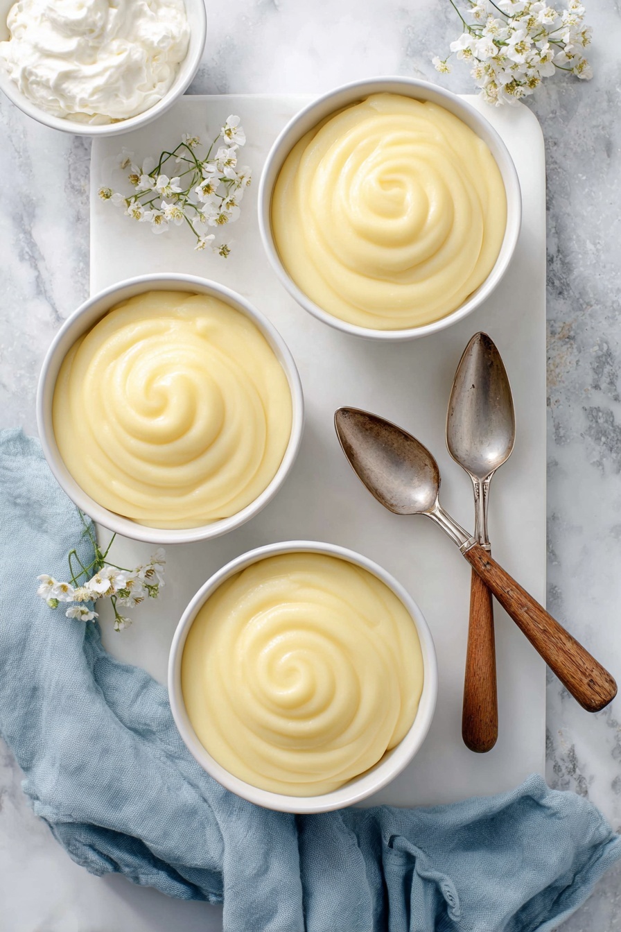 The image shows three white bowls filled with smooth, pale yellow pudding swirled in a spiral pattern on top, arranged on a white marbled board. To the top right of the bowls, there are two silver spoons with wooden handles resting on the board. A soft blue cloth is placed near the bottom right corner of the board. Near the top left corner, small white flowers are scattered delicately on the white marbled surface. Additionally, a small white bowl filled with whipped cream is partly visible on the left side of the image. The background is a white marbled texture. Photo taken with an iphone --ar 2:3 --v 7 - Homemade Vanilla Pudding, vanilla pudding recipe, easy vanilla pudding, creamy vanilla dessert, classic vanilla pudding