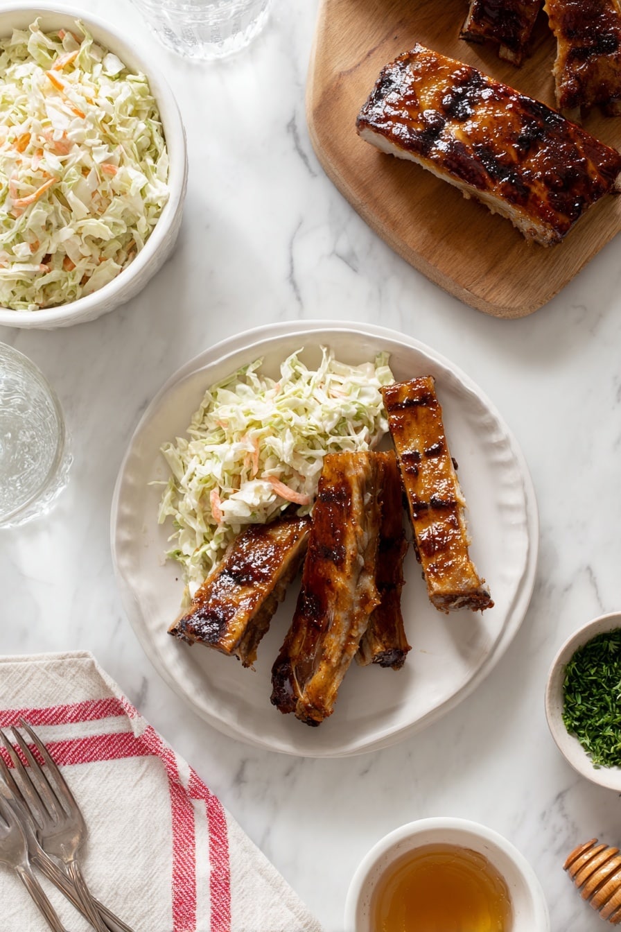 Once the glaze has caramelized and your ribs have those signature grill marks, remove them from the heat and let them rest for a few minutes. Serve them up with your favorite loaded baked potato or crisp, tangy coleslaw for a classic combo that my family can’t get enough of.