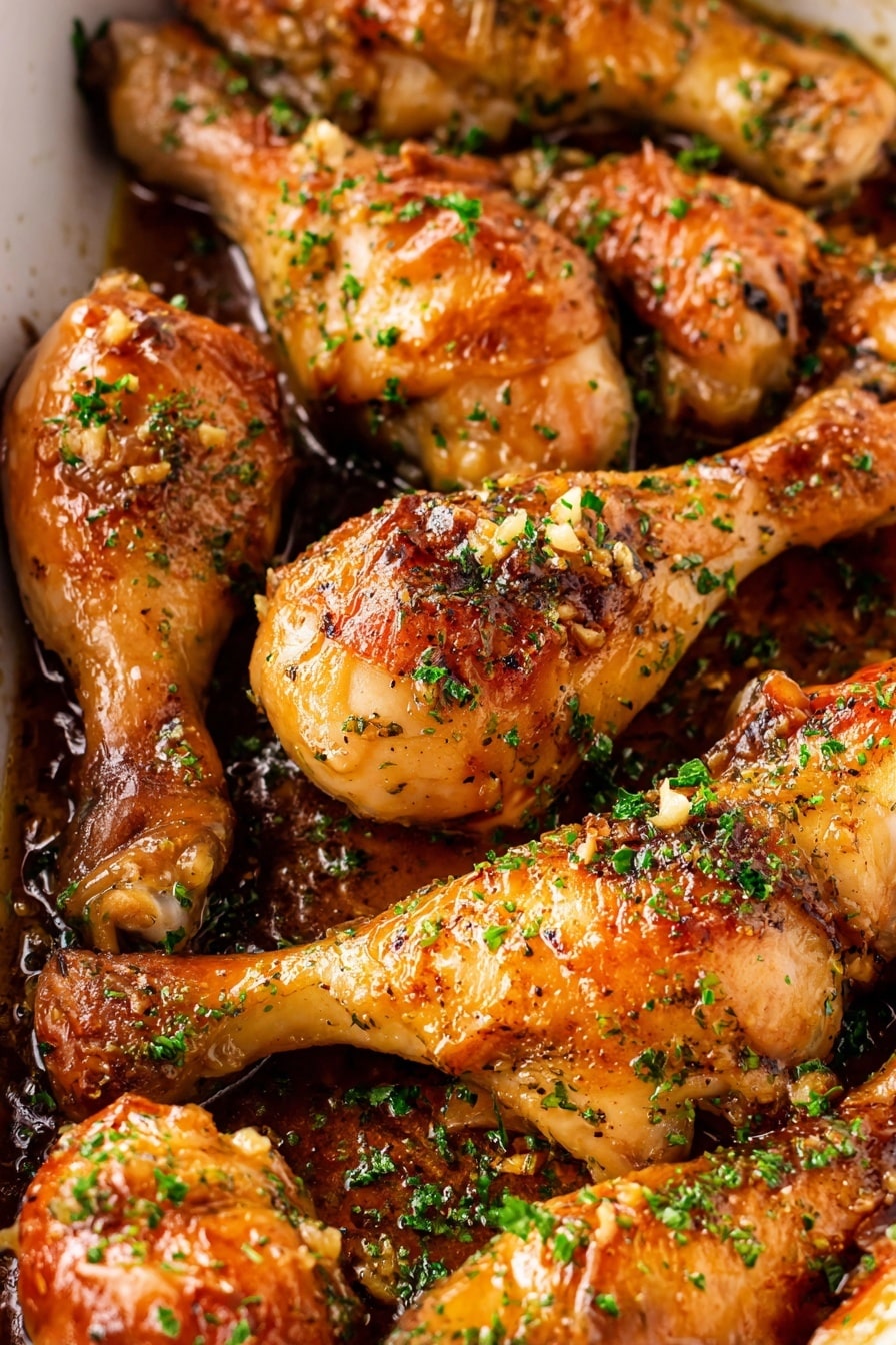 - Garnish and serve: Once baked, sprinkle the chopped parsley over the drumsticks for a fresh touch and serve with the pan sauce for added flavor.