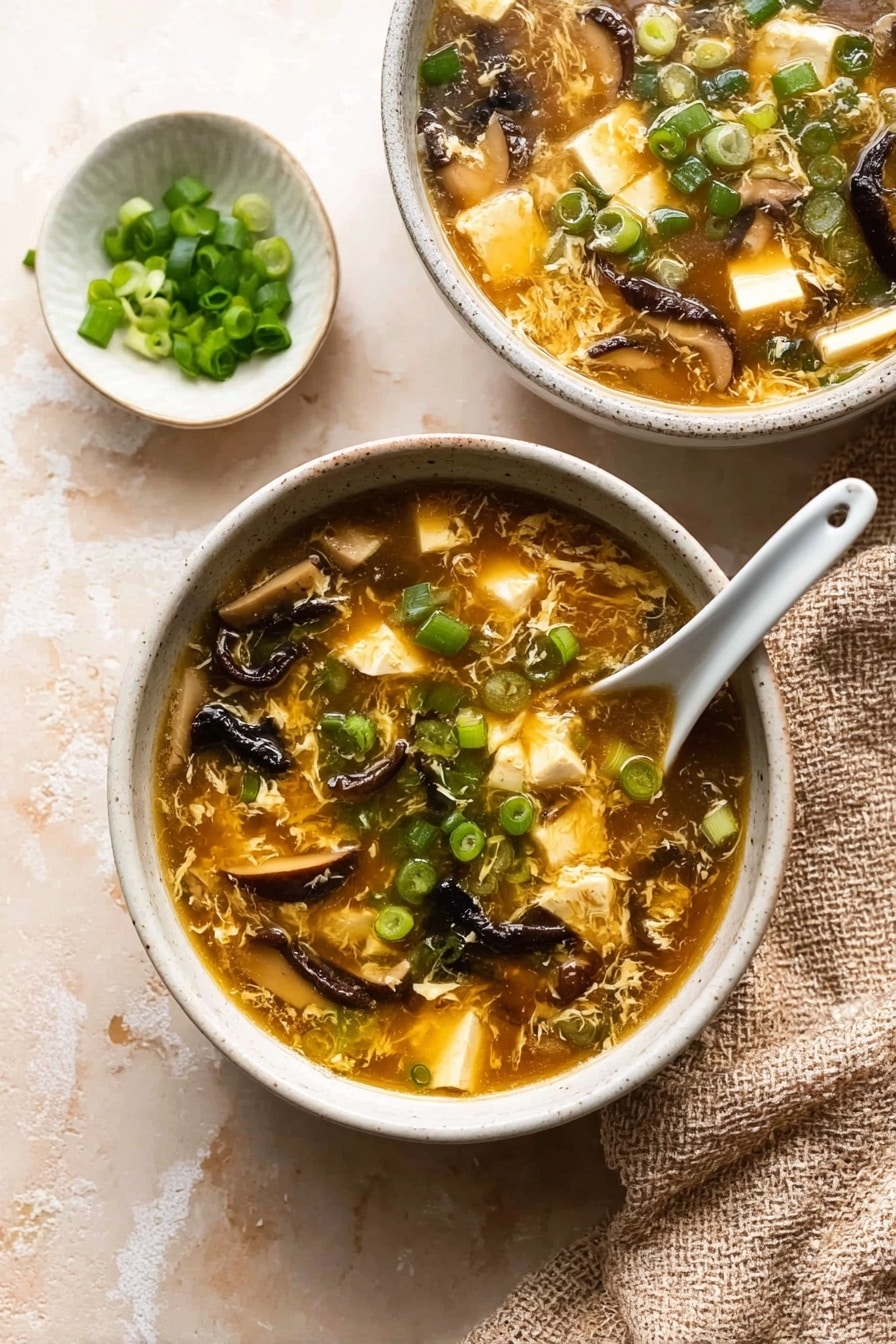 Two bowls of hot soup sit on a white marbled surface, each filled with a golden-brown broth containing visible layers of soft tofu cubes, sliced brown mushrooms, dark wood ear fungus, and thin strands of shredded egg. The soup is topped with bright green chopped scallions scattered throughout. One white ceramic spoon rests inside the bowl in the foreground. A white dish nearby holds extra chopped scallions, and a textured beige cloth lies partially under one bowl. The scene feels warm and comforting. Photo taken with an iphone --ar 2:3 --v 7 - Hot and Sour Soup with Chicken and Mushrooms, hot and sour soup, chicken mushroom soup, traditional Asian soup, tangy spicy soup