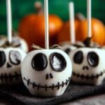 Delightfully spooky Jack Skellington Candy Apples featuring crisp Granny Smith apples coated with a smooth white chocolate shell and decorated with iconic black icing details for a festive Halloween treat.